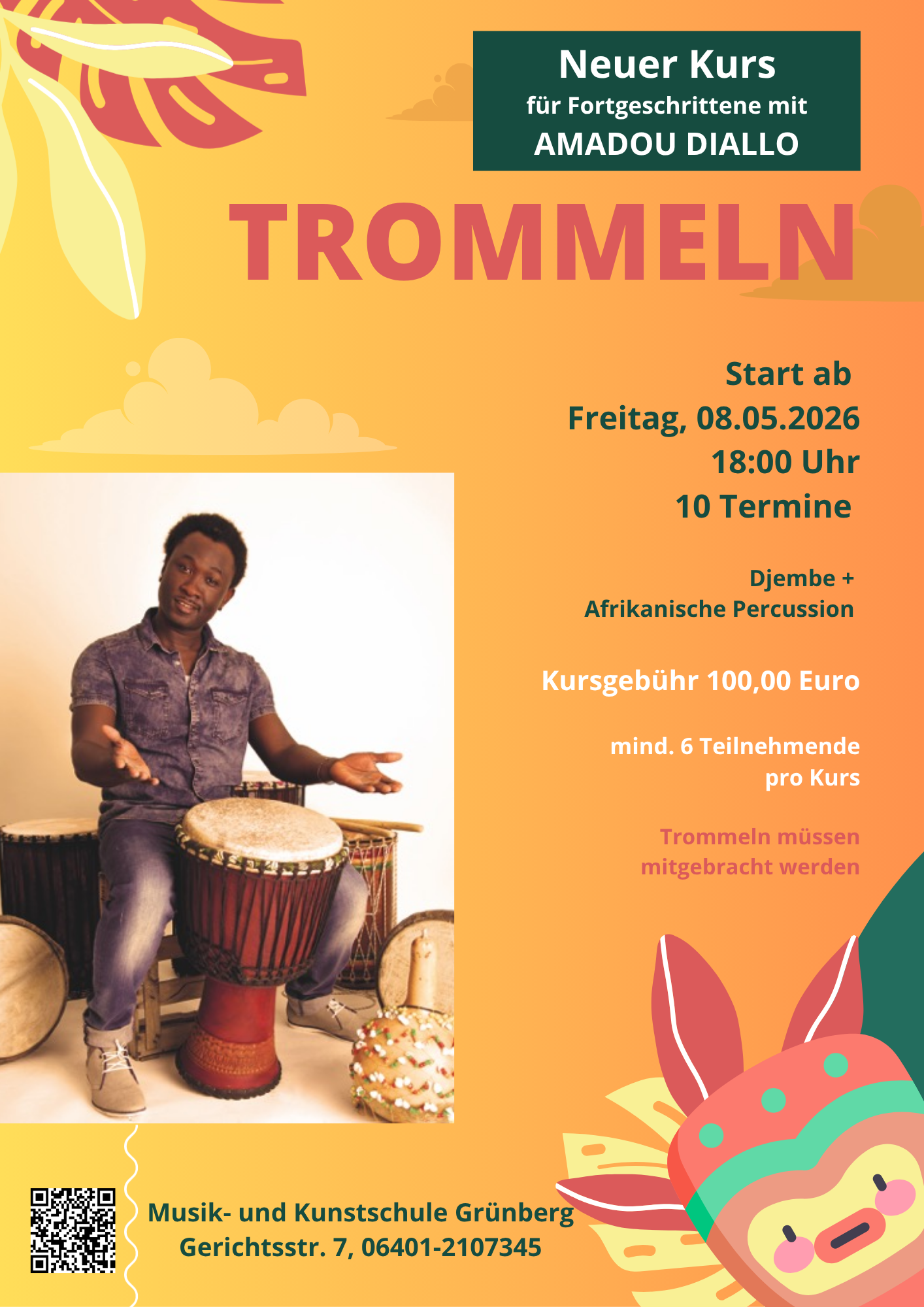 Jeden Freitag von 19:00 bis 20:00 Uhr trifft sich die Trommelgruppe für Fortgeschrittene mit Amadou Diallo im Haus der Musik.