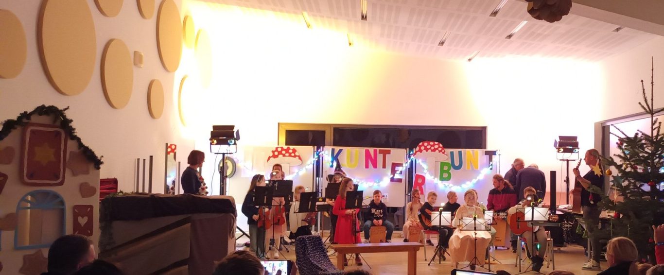 Szenen aus der Märchenwelt. Einige der Schülerinnen und Schüler hatten Sprechrollen und überzeugten mit ihrer Spielfreude. Das Musiktheater wurde vom Orchester Kunterbunt mit Liedstücken wie z. B. „Morgen kommt der Weihnachtsmann“ bis zum „Tanz der Zuckerfee“ von Tschaikowski untermalt. Diese Kooperation zwischen Musik- und Kunstschule Grünberg und der Grundschule besteht schon seit 13 Jahren.